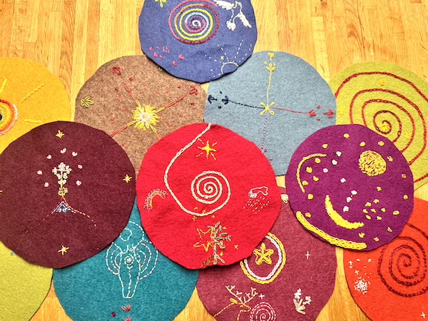 Gestalte Deine Cacao-Zeremonie bewusst und kraftvoll mit einer individuellen Kreismitte. Gerne sticke ich Dir auch Dein Wunschmotiv in Co-Kreation mit der geistigen Welt für Dich.