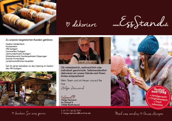 Die Produkte sind handgemacht und einfach lecker! Sie verwenden nur hochwertige und frische Zutaten. Und diese Leidenschaft fürs leckere Essen bei EssStand.de kommt mit der neuen Sichtbarkeit perfekt bei den Kunden an. Wir sind begeistert, dass wir so gut getroffen haben...