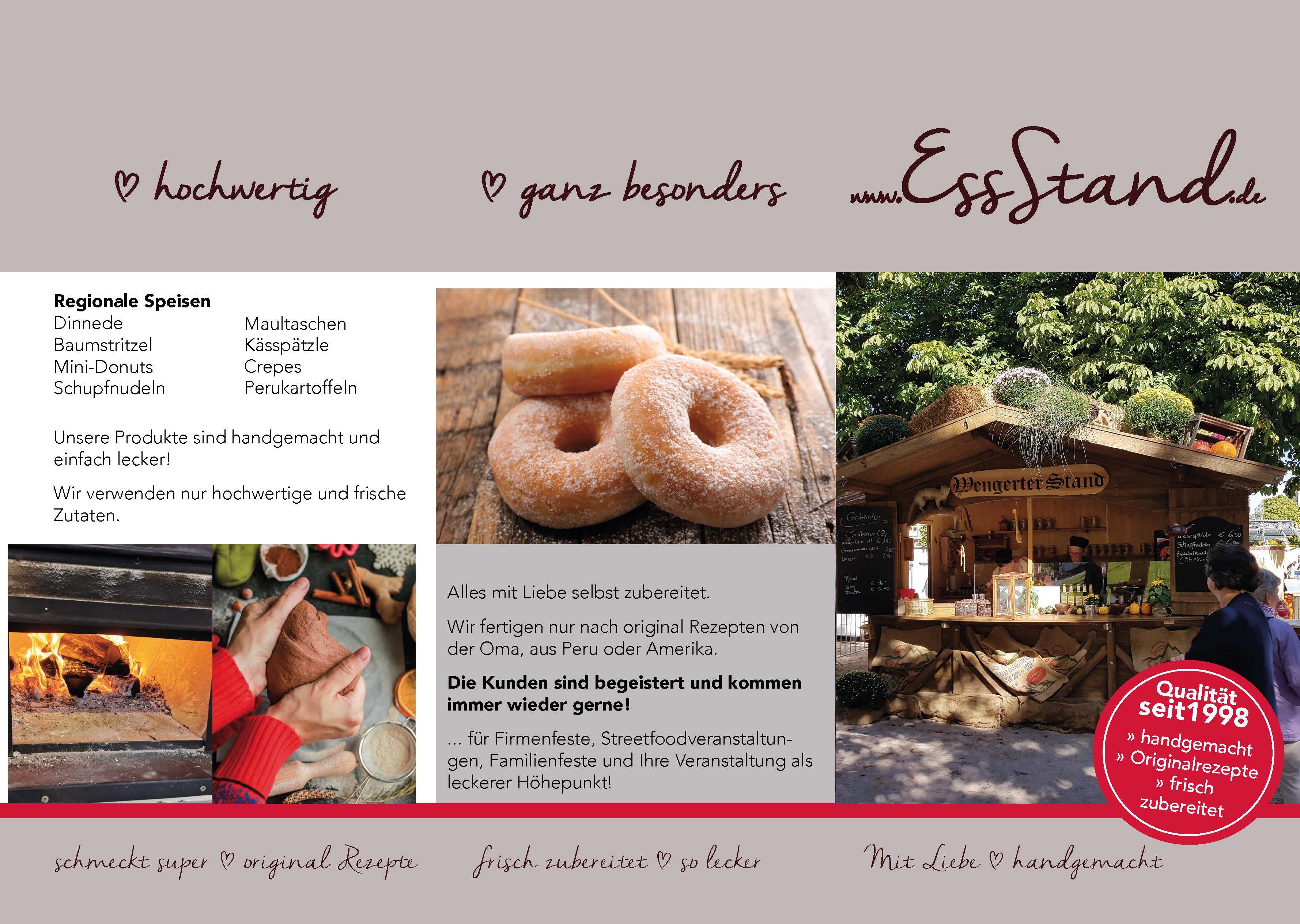 Dabei hat sie sich auf Regionale Speisen wie Dinnede, Baumstritzel, Mini-Donuts, Schupfnudeln, Maultaschen, Käßspätzlie, Crepes, Perukartoffeln...
