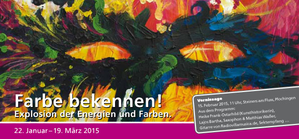 Farbe bekennen! Nicht halbherzig, sondern ganz: Farbenstark, ehrlich, kraftvoll. – Diese Ausstellung zeigt gnadenlos bunt eine andere Welt. Für die Exponate wurde ein Materialmix aus Acryl mit Kohle oder Pastellkreide auf Leinwand und Holz verwendet. Die Gemälde entstanden sämtlich zwischen 2013 und 2015. Eine Dokumentation der Entdeckung von Stärke als Explosion der Energien und Farben.