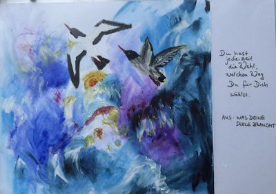 In diesem Jahr experimentierte ich für diese Ausstellung mit Formaten und interpretierte Zitate aus dem soeben erschienenen Buch 'Was Deine Seele braucht. Eine Begegnung mit Deiner wahren Natur'. Die Natur ist es auch, die in meinen Gemälden teilweise märchen- und fabelhaft, mystisch einen tieferen Ausdruck findet. Das scheinbar Verborgene sichtbar machen und in die alltägliche Wirklichkeit holen, drückt für mich eine notwendige Balance aus. Mit beiden Beinen fest auf dem Boden und gleichzeitig die Flügel weit ausgebreitet. Ich nutze den Sommer auf Pellworm für kreatives Weben und Wirken an Büchern, Kunst und in Gruppen.