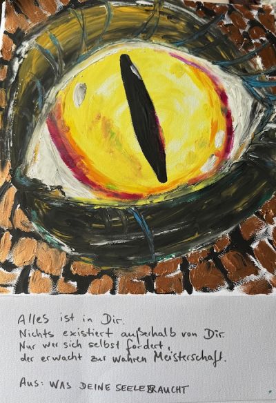 Ich male seit vielen Jahren regelmäßig in meinem persönlichen Medizinbuch und auf großen Formaten. Hierin verarbeite ich unterschiedlichste Themen, Prozesse und persönliche Erlebnisse. Die Gemälde sind sehr vielfältig und zeigen sowohl Landschaften und Pflanzen- und Tierwesen, als auch innere Welten. Meine Kunstwerke habe ich seit 2015 in mehreren Ausstellungen der Öffentlichkeit zugänglich gemacht.