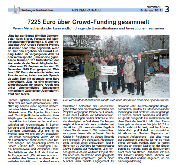 19.01.2017 - Veröffentlichung im Plochinger Amtsblatt. Herzlichen Glückwunsch zum erreichten Ergebnis! ...„Für uns ist es wichtig, dass wir uns am Ort engagieren und etwas zurückgeben. Werte, die wir als Unternehmer damit auch zu den Kindern bringen und gleichzeitig etwas für unsere Zukunft tun“, bekräftigen Claudia Schimkowski und Alexander Frank, Geschäftsführer der AHA als Initiatoren ihr Engagement."...