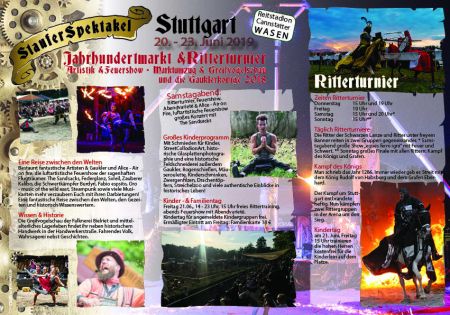 Bereits der Göppinger Mittelaltermarkt Stauferspektakel war ein großartiger Erfolg. Nach 4 Tagen Ende Mai mit tausenden von begeisterten Besuchern spektakeln wir im wunderschön grünen Reitstadion am Cannstatter Wasen Stuttgart bereits am 20. bis 23. Juni weiter.