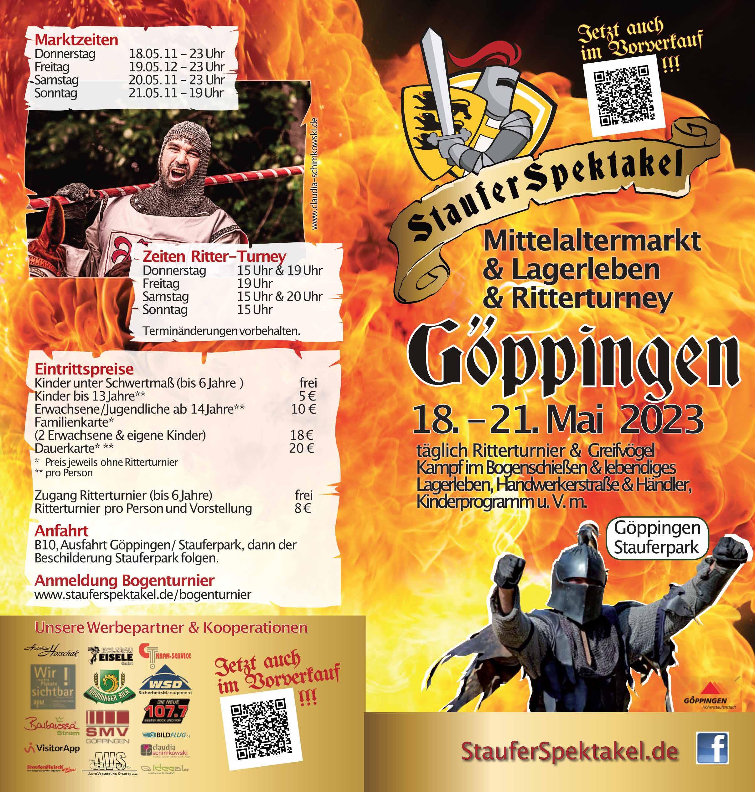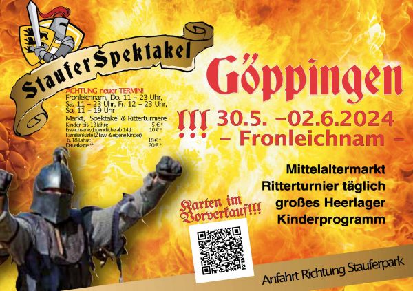 Vom 30. Mai – 2. Juni in Göppingen im Stauferpark steht im 18ten Jahr ein Mittelaltermarkt an, der Fans und Interessierte aus ganz Deutschland und darüberhinaus lockt. Dabei freuen wir uns auf bekannte Gesichter, wie die Ritter der Schwarzen Lanze, die in diesem Jahr mit täglich mehreren Turnieren hoch zu Pferde reiten. Spannenden Schwertkampf gibt es von der bekannten Showgruppe Burdyri und den Leitwölfen.