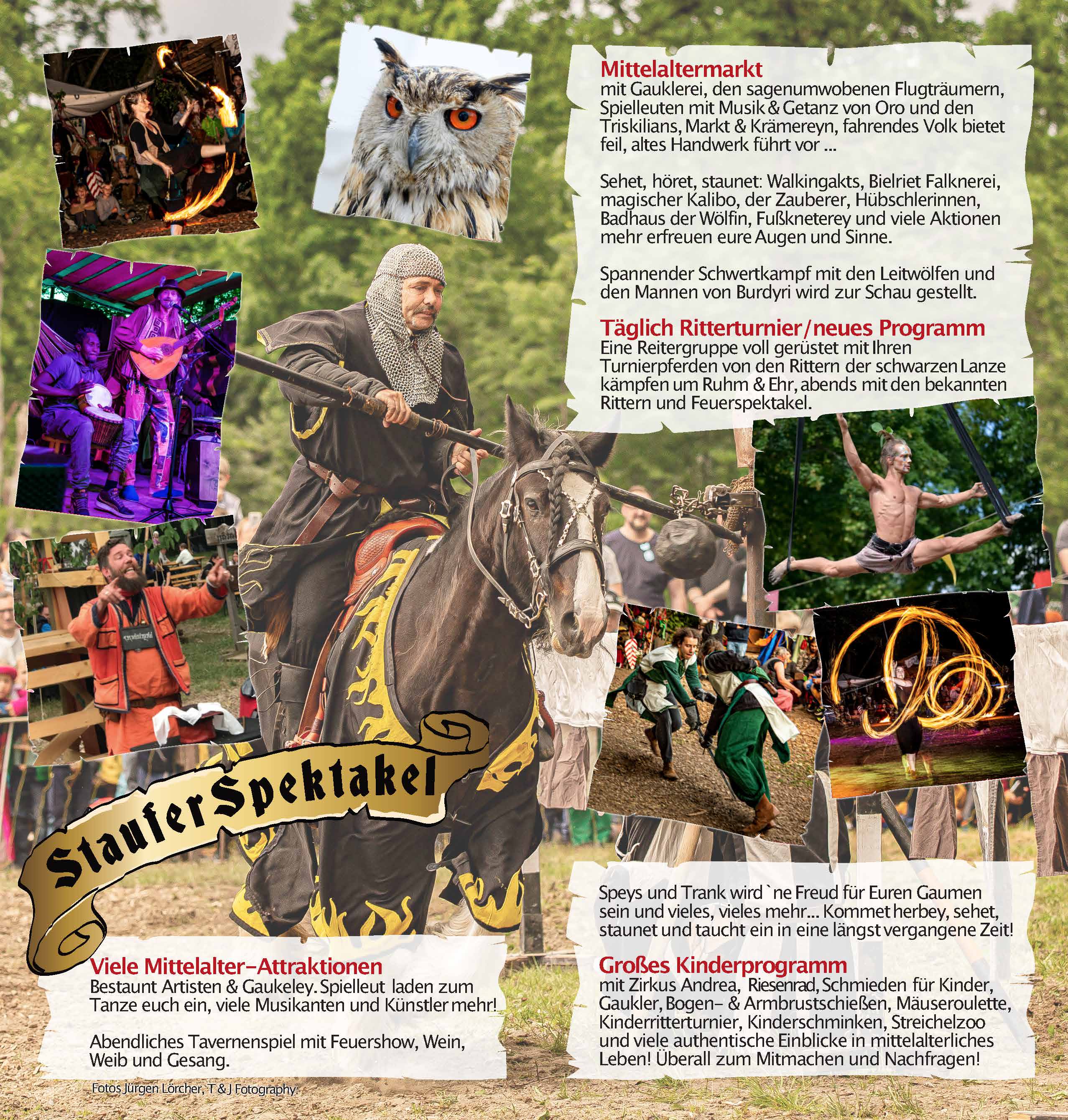 Das Kindermitmachprogramm ist vielfältig mit Specksteinwerkstatt, Steinglücksrad, Körbe flechten, Papier schöpfen, Kerzenziehen, Armbrustschießen, Kinder schminken, Kinderbogenschießen, Kinderzirkus mit Andrea und vieles mehr. Auch die Handwerkerstraße ist vielseitig und spannend: Steinmetz, Bildhauer, Münzpräger, Kettenhemdmacher, Schmied, Puntiererei, und Lichtermacher sind dabei. Dem Gerber und der Lederwerkstatt kann man bei seiner Arbeit über die Schulter schauen und auch das eine Näherei und die Blumenbinderin ist vertreten.