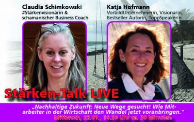 DAS war ein wunderbarer Stärken Talk Live! DAS Thema „Nachhaltige Zukunft: Neue Wege gesucht! Wie Mitarbeiter in der Wirtschaft den Wandel jetzt voranbringen.“ Von Katja Hofmann und Claudia Schimkowski.