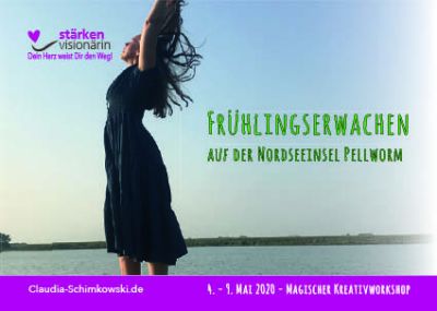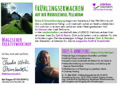 4. - 9. Mai 2020 - Pellworm Frühlingserwachen auf der grünen Nordseeinsel Pellworm - Magischer Kreativworkshop mit Claudia Ulrike Schimkowski. Nutze die Kraft des Frühlings für Dich und in Deinem erfüllenden Leben zwischen den unterschiedlichen Anforderungen in Deinem Alltag. Pellworm ist für viele eine Reise in eine andere Welt. Hier ticken die Uhren noch anders. Ruhe und Entschleunigung beginnen bereits auf der Fährfahrt durch die wunderschöne Hallig- und Inselwelt vorbei an Seehundsbänken ab Nordstrand.